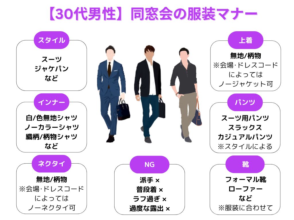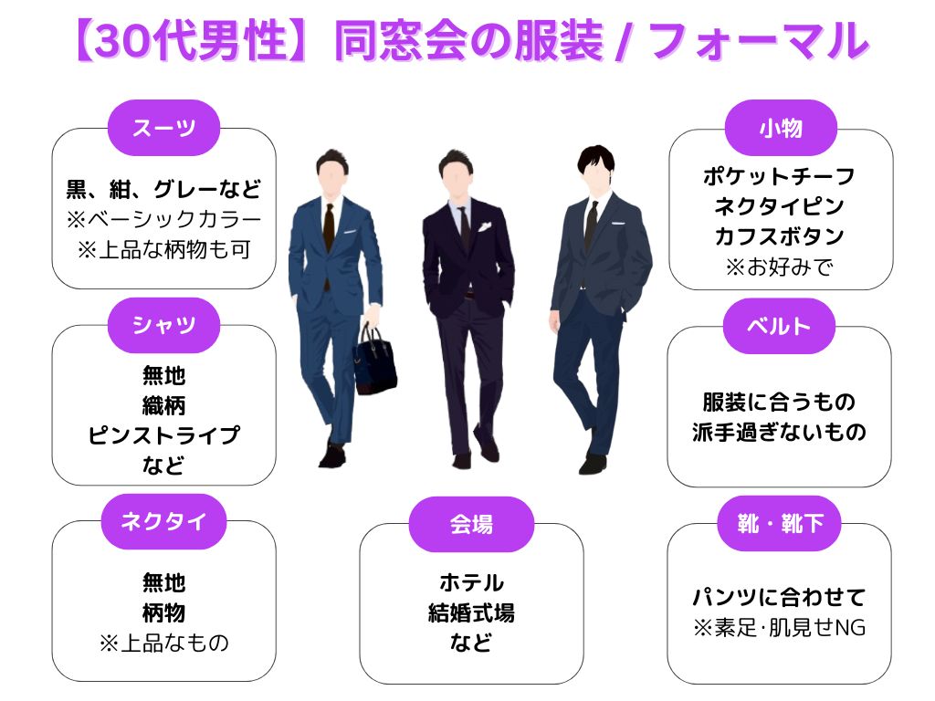 同窓会における30代男性の服装は、スーツスタイルやジャケパンスタイルなどを会場やドレスコード、季節に合わせて選びましょう。