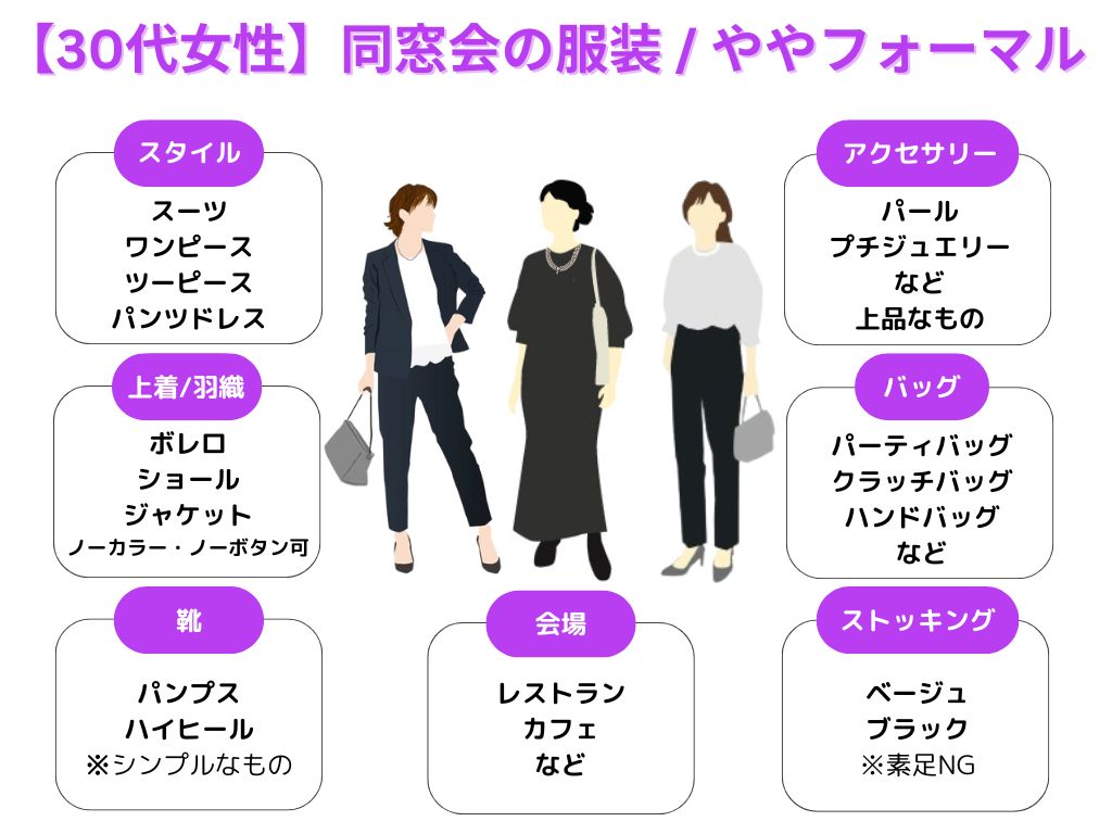 同窓会での30代女性の「ややフォーマル」な服装スタイル