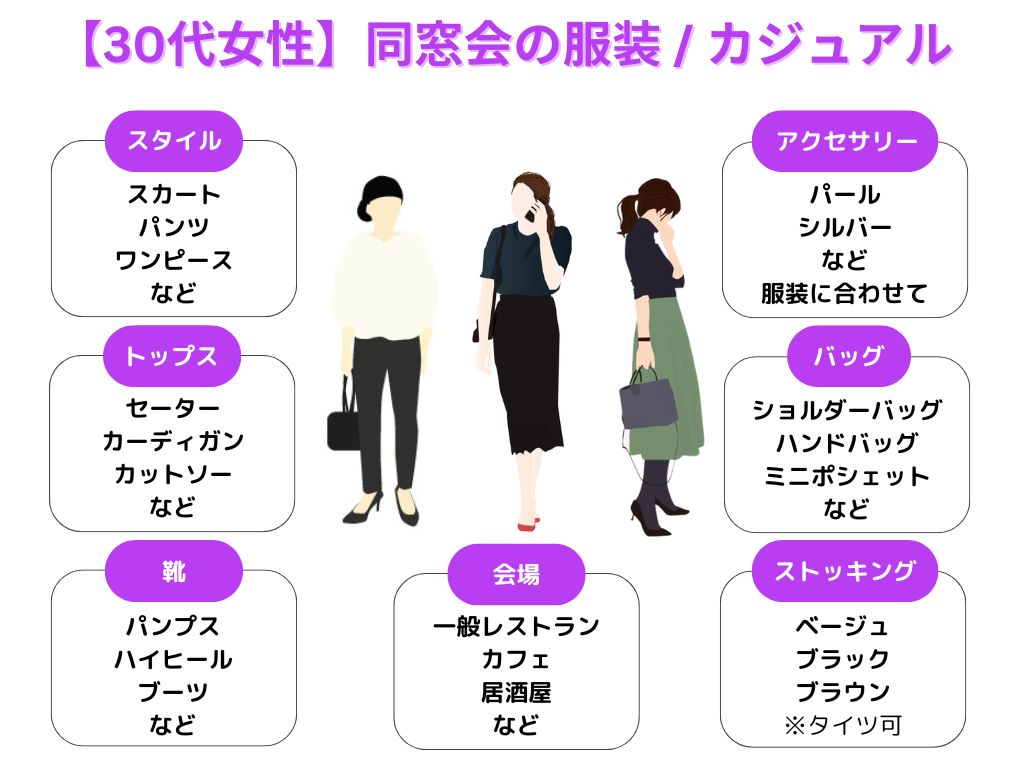 同窓会での30代女性の「カジュアル」な服装スタイル