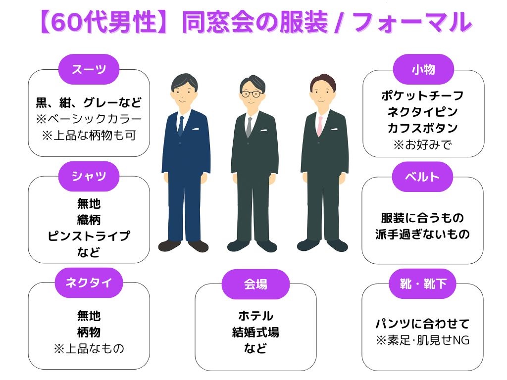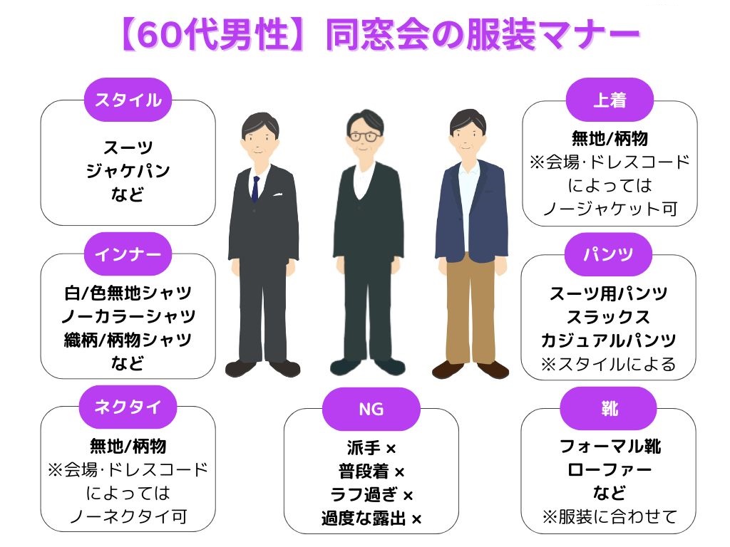 同窓会における60代男性の服装は、スーツスタイルやジャケパンスタイルなどを会場やドレスコード、季節に合わせて選びましょう。