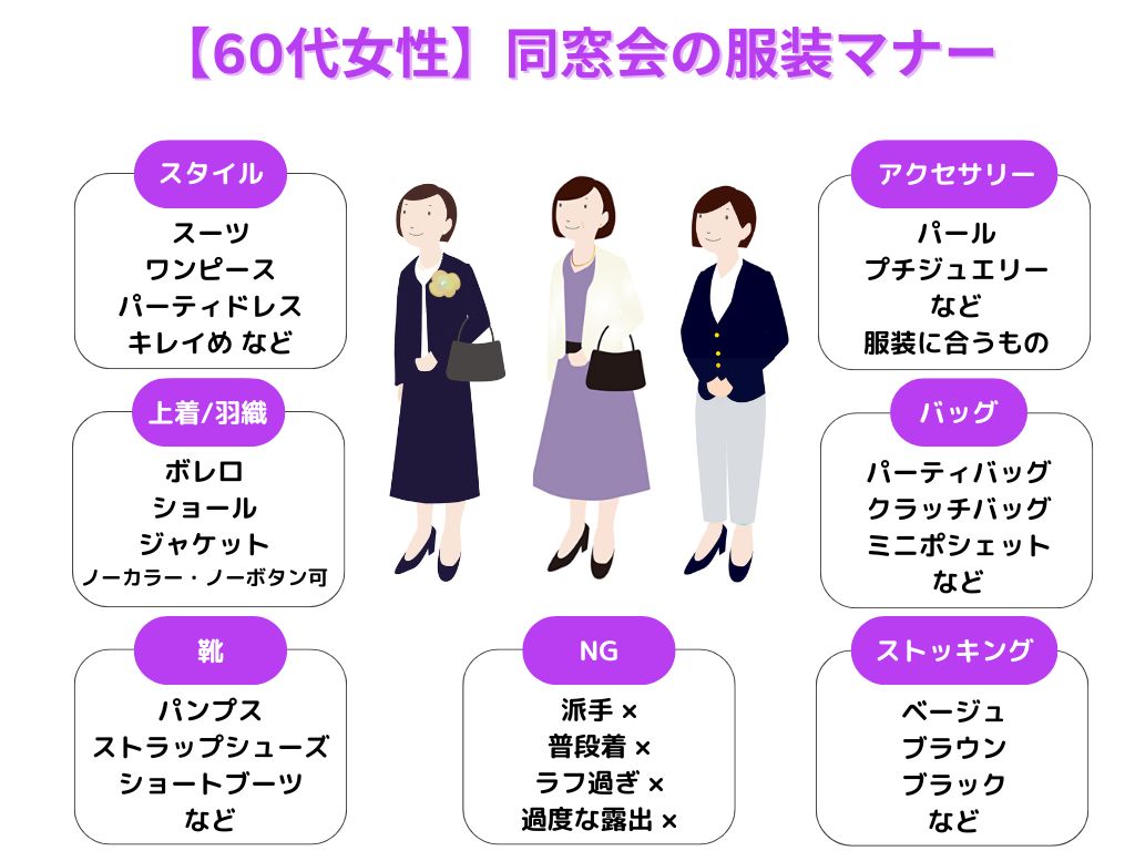 本記事では、同窓会にふさわしい60代の服装マナーやおすすめの服装スタイルを男女別で紹介しました。
