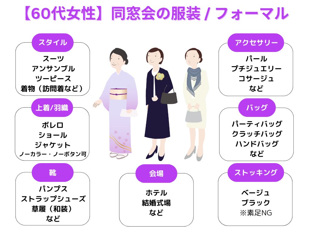 同窓会における60代女性の服装は、パーティドレスやワンピース、スーツなどを会場やドレスコード、季節に合わせて選びましょう。