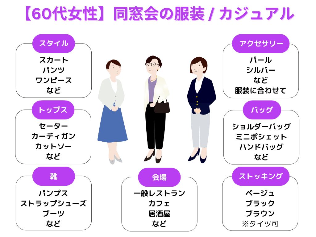 同窓会での60代女性の「カジュアル」な服装スタイル