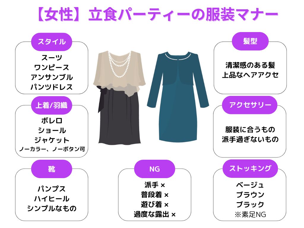 正式なマナーは昼なら「アフタヌーンドレス」、夜なら「イブニングドレス」や「カクテルドレス」ですが、一般的な立食パーティーであれば上品なドレススタイルでかまいません。