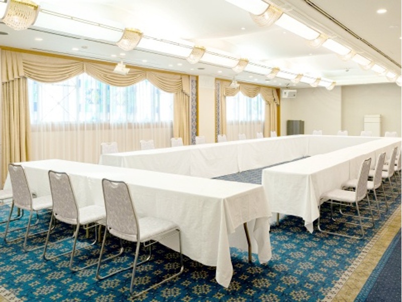 「飛翔」は、窓から光が差し込む開放感あふれる空間が魅力の洋室です。多様な会議、イベント、宴会など、幅広いシーンでご利用いただけます。広々とした110㎡の会場は、最大120名収容可能なシアター形式の講演会から、72名収容のスクール形式のセミナー、口の字型48名、コの字型43名の会議、さらには立食形式で60名規模の懇親会まで、お客様のニーズに合わせた最適なレイアウトで対応可能です。窓からの採光を活かした明るい雰囲気の中で、実り多い時間をお過ごしください。