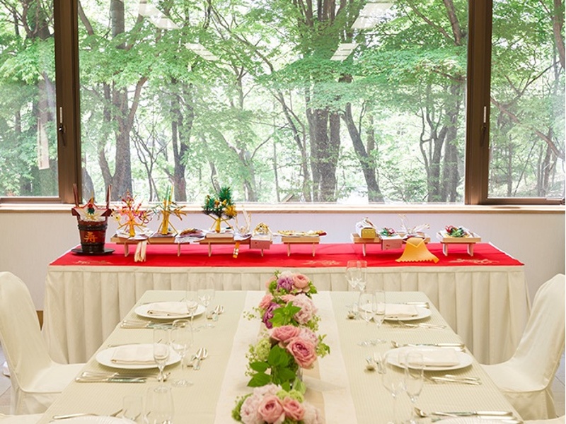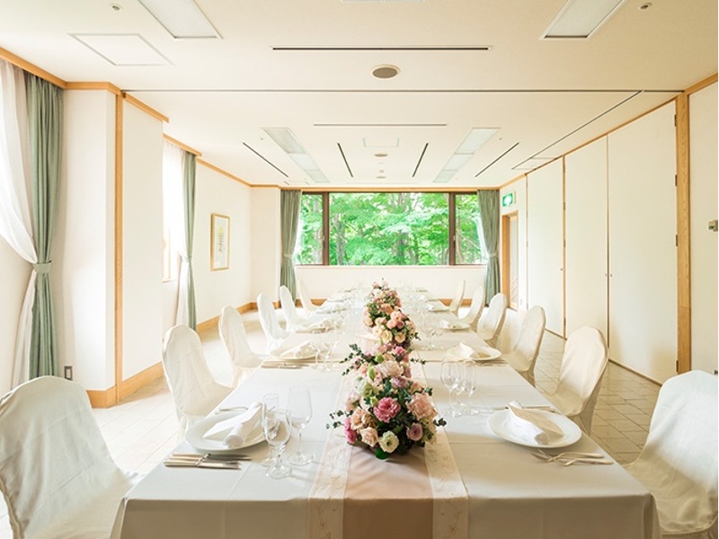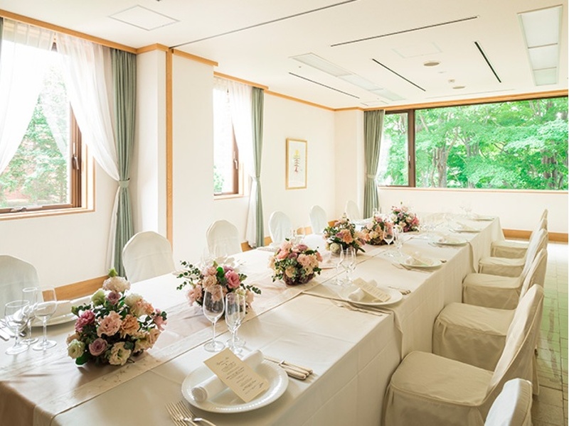 窓から望む自然の景色が、和やかで落ち着いた雰囲気を演出する「樹海の間」。少人数でのご会食はもちろんのこと、集中して取り組みたい会議やセミナーにも最適な空間を提供します。心地よい自然光が差し込む中で、参加者同士の会話も弾み、生産性の高い時間を過ごせるでしょう。木々の緑に囲まれ、都会の喧騒から離れた場所で、特別なひとときをお過ごしいただけます。