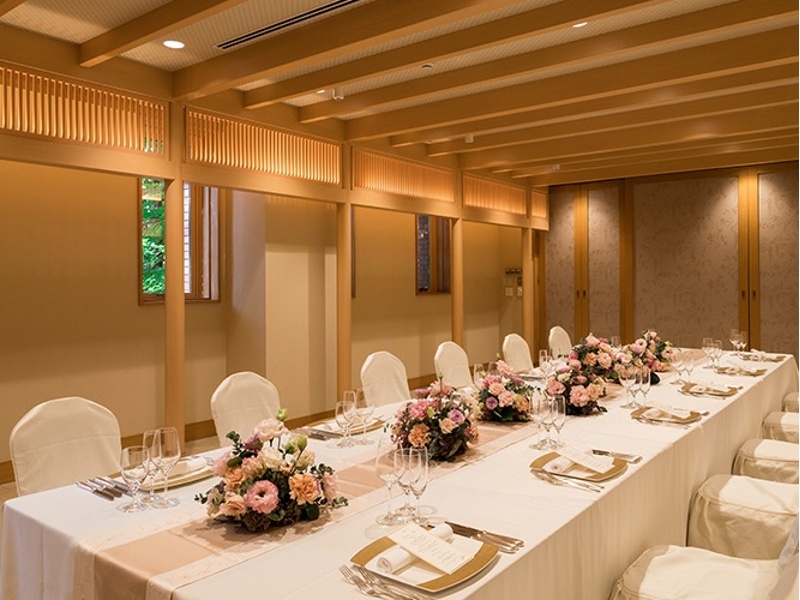 「高坏の間」は、間接照明の優しい光に包まれた、心落ち着く和の空間が魅力です。日本の伝統美を感じさせるしつらえは、少人数でのご会食に格調と温かみをもたらします。プライベートな雰囲気の中で大切な方々と語らうひとときや、集中して取り組みたい会議、セミナーなど、多岐にわたるシーンでご利用いただけます。和やかながらも品格のある空間で、実り多い時間をお過ごしください。