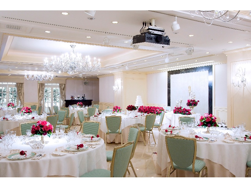 ANAクラウンプラザホテル松山の「ローズルーム」は、邸宅のような落ち着きと上質さを兼ね備えたバンケットです。大理石を敷き詰めた床にシャンデリアの光がきらめき、大切なひとときを上品な雰囲気で演出します。専用のホワイエ(会場前ロビー)を備えているため、ゲストの待ち時間も工夫次第で印象的な空間にアレンジ可能です。最大80名の立食、70名の正餐、50名のスクール形式、120名のシアター形式に対応し、特別なパーティーからフォーマルな会議まで、あらゆるシーンを優雅に彩る「ローズルーム」で、忘れられないイベントを実現しませんか。