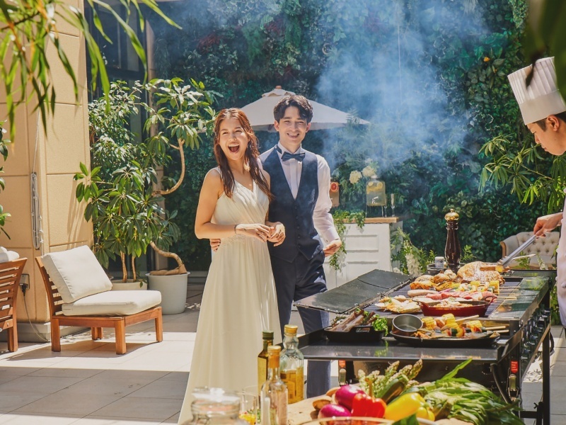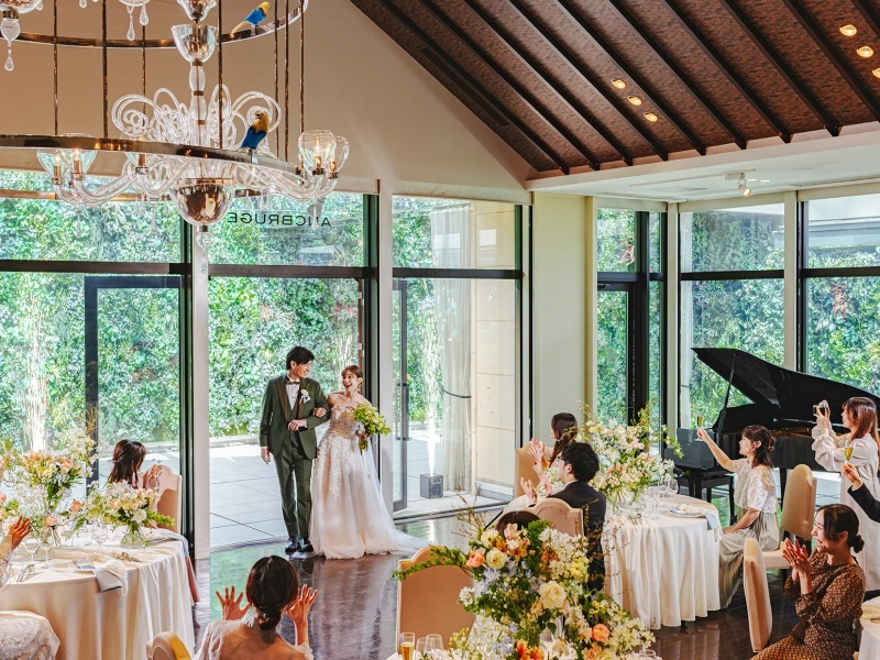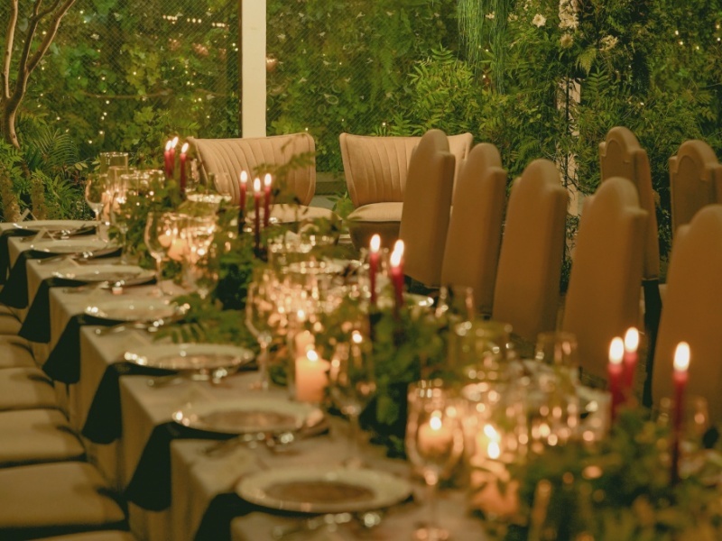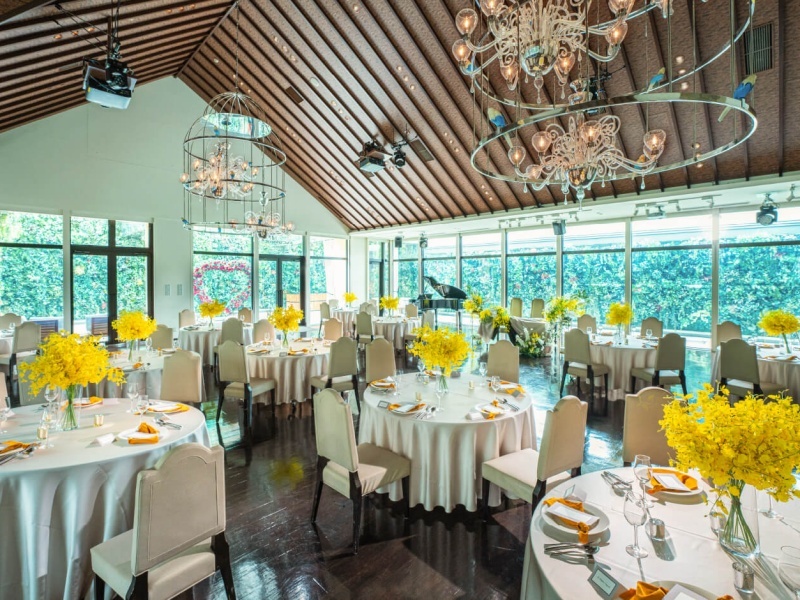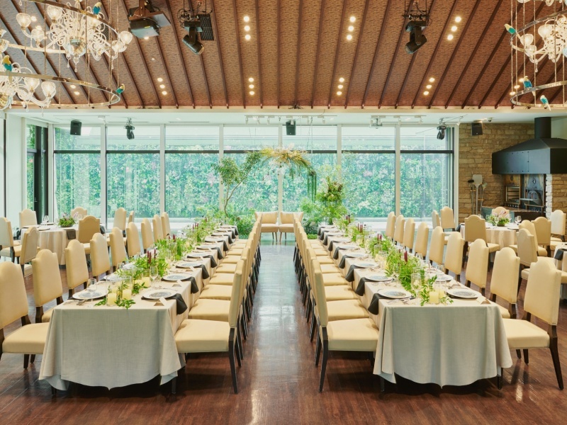Ancbruge in the Forestは、3面に広がる大きな窓が特徴の明るく開放的なメインダイニングです。60名から130名までのパーティに対応し、プライベートガーデンや専用スイーツラウンジも隣接。ワンフロアを貸し切ってご利用いただけるため、ゲストとの一体感を大切にしたパーティが実現します。広々とした空間には、空気を一変させるプロジェクションマッピングなどの最新映像設備も完備されており、ゲストを魅了するドラマチックな演出が可能。開放感とプライベート感を兼ね備え、忘れられない特別な一日を彩る理想的な空間です。