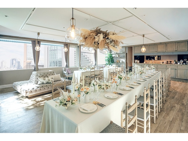 【会場紹介】窓の外に開放感ある大阪梅田の景色が広がるオープンキッチンを併設したパーティ会場では、結婚式場の装飾・設備を使用した宴会・展示会・イベント・撮影など、あらゆる用途にご利用いただけます。マイク、音響機材、プロジェクターを完備しており、〜80名(立食)・〜60名(着席)の各種宴会やチャペル・フォトブースを用いての撮影会の実績がございます。