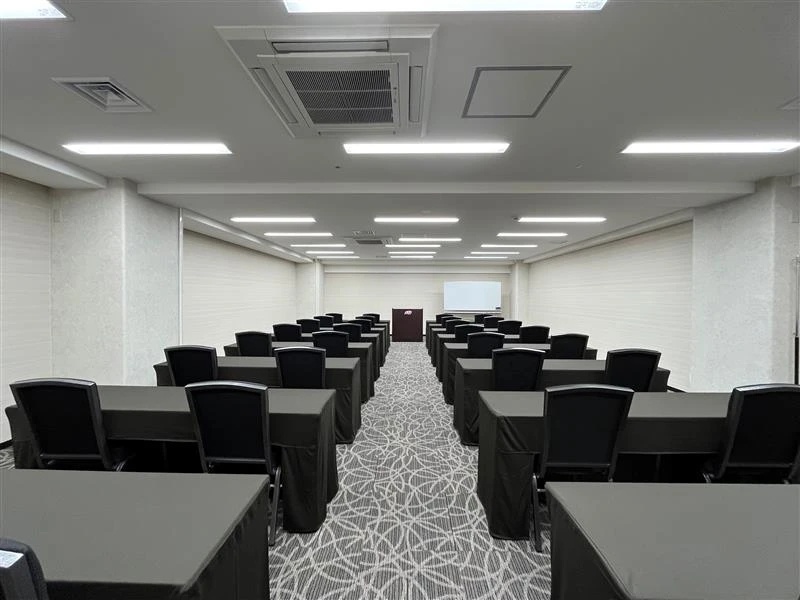 84.0㎡の広々とした空間と2.5mの天井高が特徴のカンファレンスルーム5Eは、最大94名まで収容可能な多機能会場です。スクール形式で48名、対面式の口の字で42名、コの字で36名、さらに立食で50名、着席で24名と、様々なイベントに対応する柔軟なレイアウトが可能です。ビジネス利用から懇親会まで、用途に合わせて最適な環境を提供します。