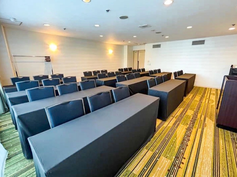 「9F:紅花」は、54.6㎡の広さと2.38mの天井高を誇る、落ち着いた雰囲気の会場です。スクール形式で36名、島型で36名、口の字で24名、コの字で18名、シアター形式で49名まで対応可能。様々なレイアウトに対応できる柔軟性が特徴で、少人数から中規模の会議、研修、セミナー、プレゼンテーションなど、幅広いビジネスシーンに最適です。参加人数や用途に合わせた最適な空間で、集中力が高まる快適な環境を提供し、円滑なイベント運営をサポートします。