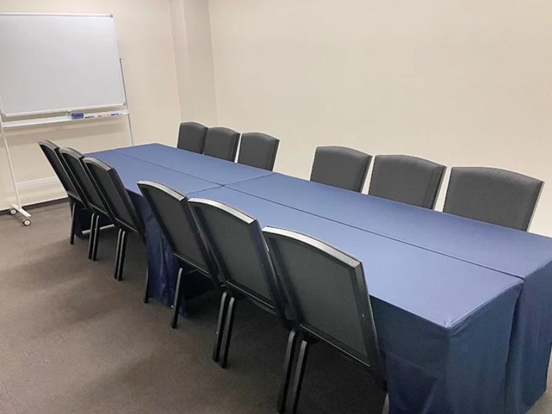 ミーティングルーム3Eは22㎡のコンパクトな空間で、天井高は2.5mと開放感も確保されています。島型レイアウトで最大12名まで収容可能なので、少人数の会議や打ち合わせ、面接、個別指導などに最適です。集中して議論を深めたいビジネスシーンにぴったりの会場です。