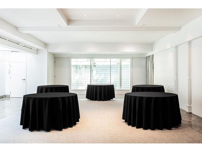 ワイヤレスマイク2本、プロジェクター、100インチスクリーン、音響システム、Wi-Fi、テーブル、椅子、司会台、冷蔵庫、冷凍庫、遮光シート