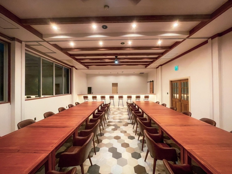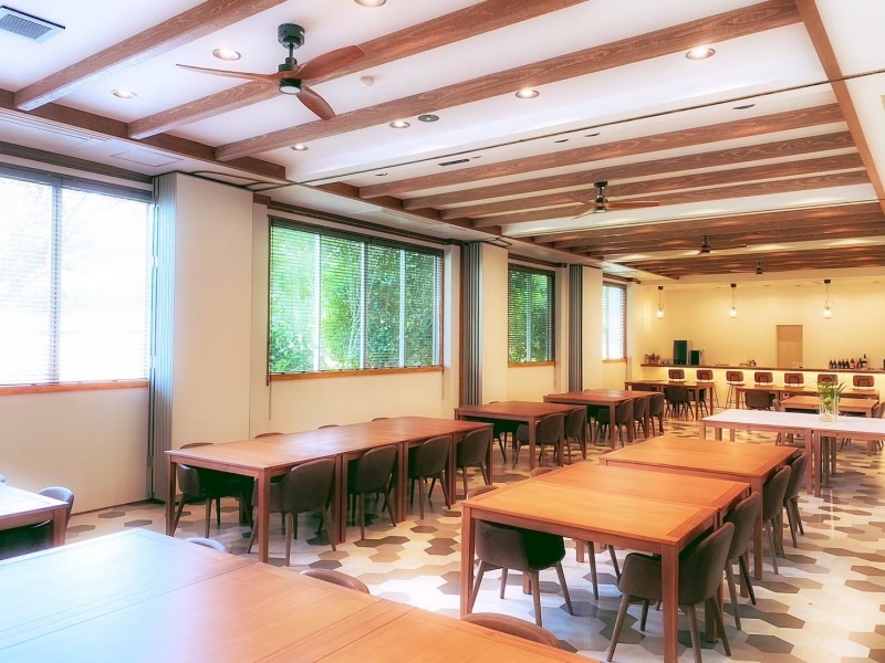 「お食事会場」は、椅子・テーブル席でゆったりとくつろげる、落ち着いた雰囲気の空間です。約100畳もの広さを誇り、間仕切りを活用することで、お客様の人数や目的に合わせて柔軟にレイアウトを変更できます。少人数でのご利用から、大人数でのご宴会まで、幅広いシーンで常に快適な環境をご提供。個人利用はもちろん、ご家族やご友人とのグループ利用、企業の団体様での懇親会など、様々なお集まりに最適です。広々とした空間で、心ゆくまでお食事をお楽しみいただけます。