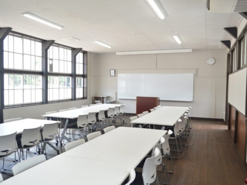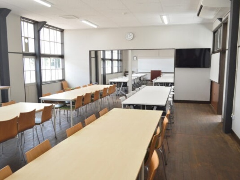 都心から車で70分、145年の歴史を持つ廃校をリノベーションした当施設の会議室兼食堂は、130.18㎡の広々とした空間に最大112名まで収容可能です。