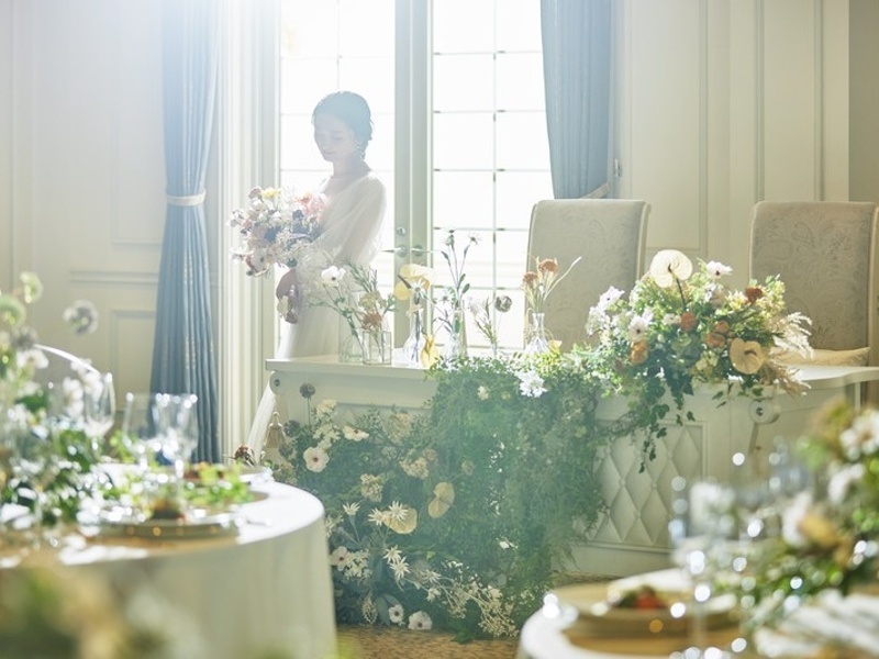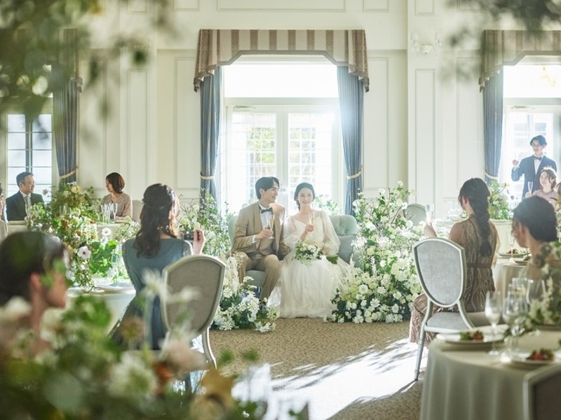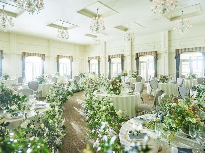 ヨーロッパの邸宅を思わせるラグジュアリーなパーティ会場「ル・マノワール」。陽光あふれる開放的な空間は、天井が高く、エレガントシックな雰囲気です。ガーデンへの自由な出入りが可能で、デザートビュッフェなどの演出も楽しめます。華やかなシンデレラ階段からの入場はゲストを魅了し、迫力の大スクリーンを使った映像演出も充実。立体的な壁面やきらめくシャンデリアが彩る空間は、どんなコーディネートにも映えます。最大160名まで収容可能で、ゆとりの広さを活かしたフォトブースの設置など、自由なアレンジで二人らしいパーティを実現できます。大切な人をもてなすための「家」として、記憶に残る一日を創造します。