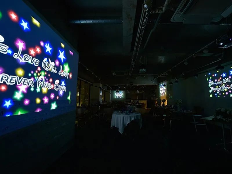 店内の設備は非常に充実しており、プロジェクター4台、100インチのスクリーン、PC、DVD、ブルーレイディスクを完備。会場内を包囲するように複数のスピーカーが設置されているため、どこにいても迫力の映像&サウンドを堪能できる。DJブースを使った演出や、ステージを使った余興も可能。