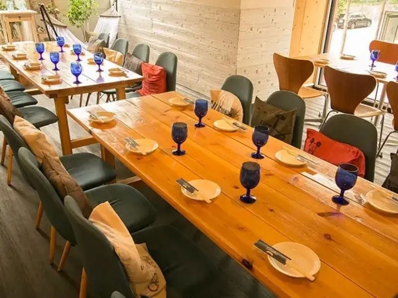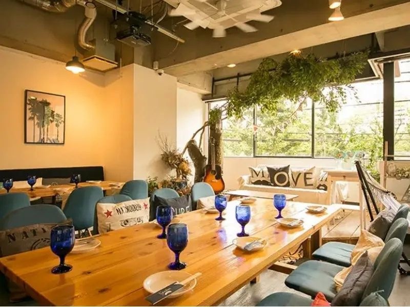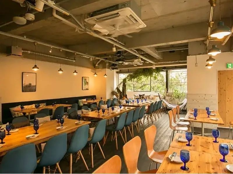 西海岸をイメージしたお洒落な空間「ジャルディーノ」は、企業パーティーなどの大規模宴会に最適な貸切会場です。最大120名様まで収容可能で、100インチスクリーン4面、10台のスピーカーによる大迫力の映像・音響設備を完備しており、余興やプレゼンテーションを華やかに演出します。照明、マイク、プロジェクター、PC接続、DVDプレイヤー、DJブース、ステージといった充実した設備がすべて無料で利用可能です。バンド演奏、インスタントカメラ、ビンゴゲーム、フォトプロップス、席札の手配など、イベントを盛り上げるための多様なサービスも提供しています。控え室やクロークも完備し、幹事様の負担を軽減。思い出に残るパーティーをサポートします。