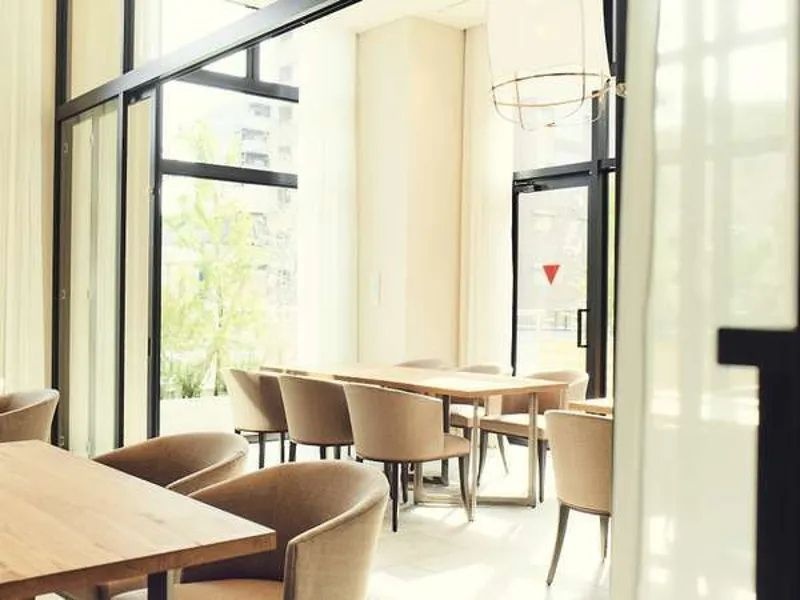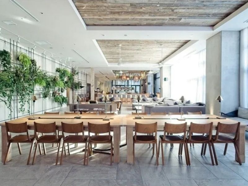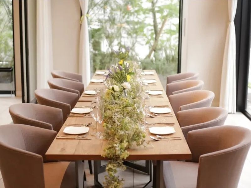 ホワイトを基調とした空間にウッディーなインテリアが並ぶ、ナチュラルテイストなパーティースペース。天井高4mの広々としたフロアには大きな窓ガラスから自然光が燦々と降り注ぎ、開放感は抜群。