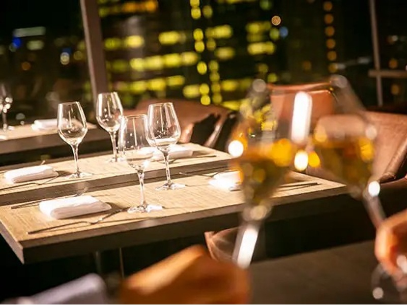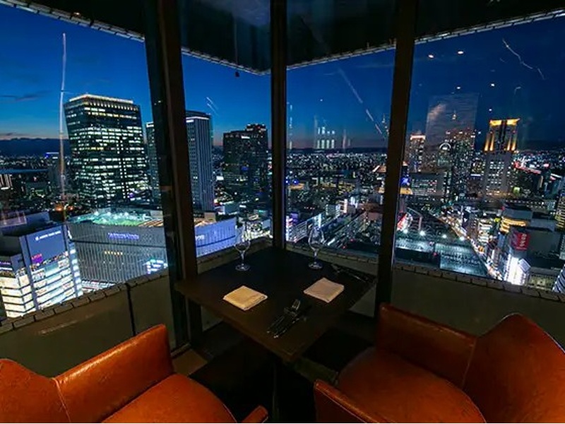 店内は全面ガラス張りで、昼は梅田の街並みを、夜はきらめく夜景を望む贅沢な空間が広がります。