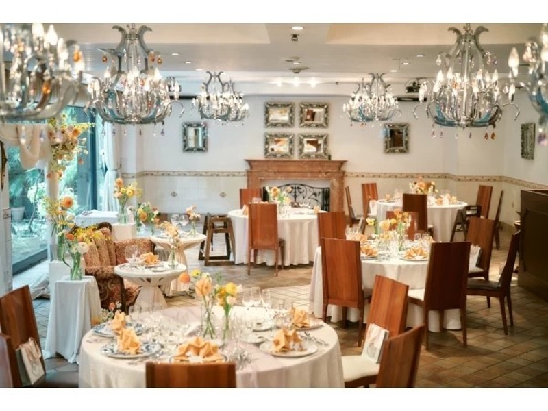 会場の正面には、高さ4 メートルの壁面緑化。テラコッタとイタリアタイルのシックで落ち着いた大人数の歓送迎会にもどうぞ。