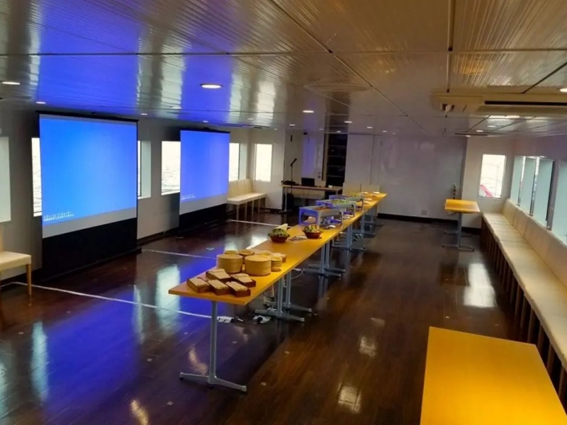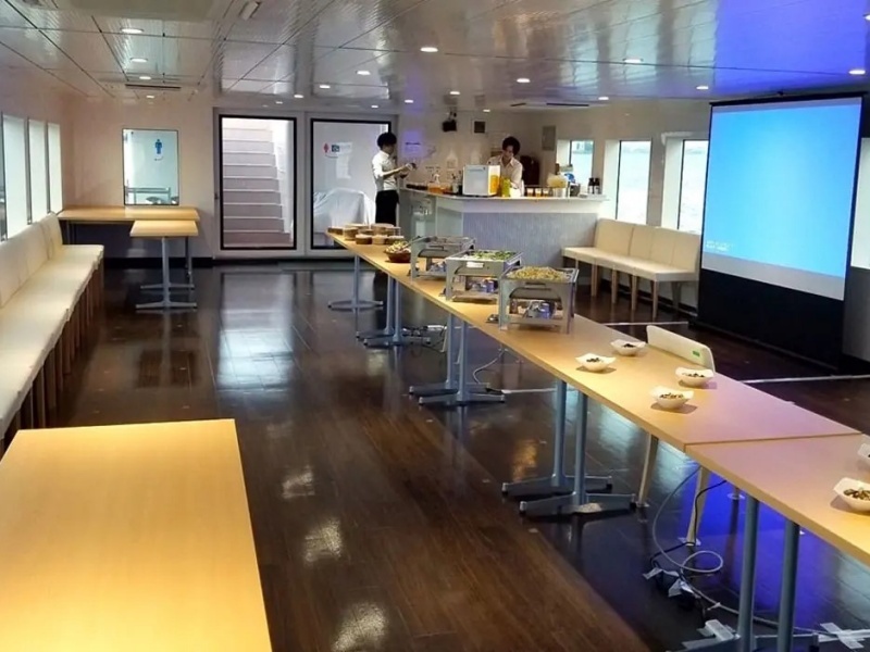東京湾チャーター船の中でも最大級の「ロサアルバ」は、非日常の体験と感動を提供する豪華な空間です。1階メインフロアは多目的なイベントスペースとして利用可能で、2階スカイデッキは最大180名様まで収容できる広大なスペースを誇ります。開放感あふれるデッキからは、東京、横浜、川崎工場エリアの絶景を360度パノラマで満喫いただけます。カジュアルなパーティーから、企業様の懇親会や記念式典といった法人利用まで、幅広いシーンに対応。半立食形式はもちろん、テーブル着座式の宴席も可能で、お客様の多様なニーズに合わせた柔軟なレイアウトが魅力です。大人数での華やかなイベントを計画されている方に最適な一隻です。