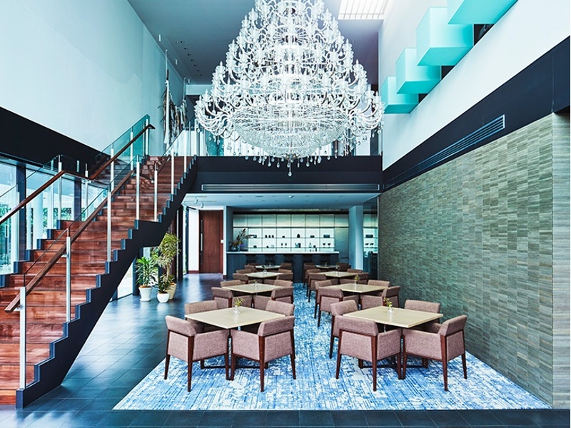 1Fラウンジは132㎡の広々とした空間に、8mという開放感あふれる高い天井が特徴です。着席スタイルで50名様、立食スタイルで80名様まで収容可能で、中規模のイベントやパーティに最適です。iPod対応設備や無線LANも完備しており、会議やセミナー、懇親会など様々な用途にご利用いただけます。スタイリッシュな空間で、ゲストとの特別な時間をお過ごしください。