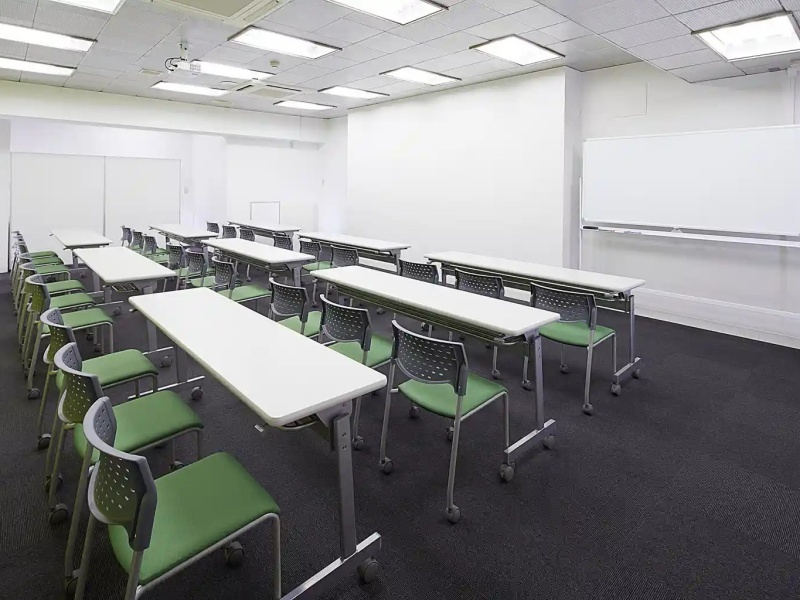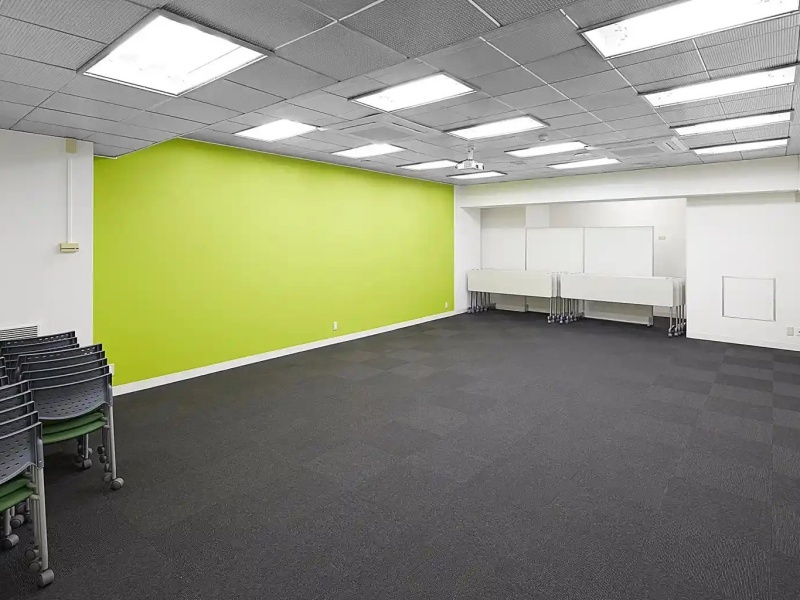 JR中央線「神田駅」西口より徒歩4分、東京メトロ丸の内線「淡路町駅」より徒歩4分、東京駅からも徒歩14分と好立地な貸し会議室。ホワイトボード・スクリーン・プロジェクター・マイクセットなど会議に便利な設備が全て無料でご利用いただけます。無料WiFiも完備で、WEB会議やオンラインセミナーなどにもおすすめ。スクール形式27名、最大27名利用可能な当施設は、面接や勉強会といったビジネス利用はもちろん、白とグリーンで清潔感のある室内を活かした動画配信や会議シーンの撮影場所としてもご利用いただけます。