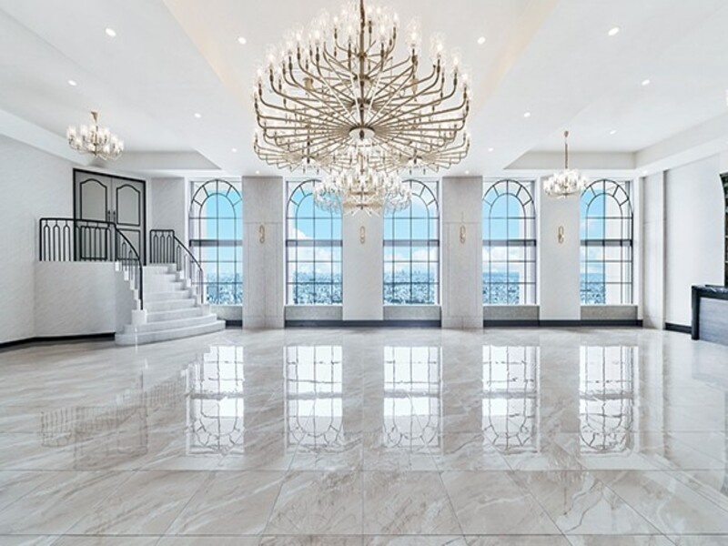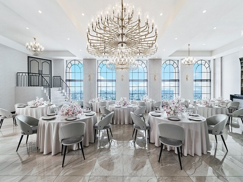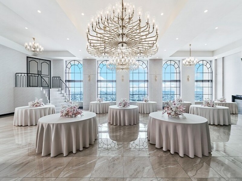 「ザ シティ」は、ファッショナブルで輝くニューヨークをコンセプトにデザインされた、洗練された披露宴会場です。広がるアーチ窓からは、都会の息をのむような絶景が一望でき、まるでニューヨークの夜景に包まれているかのような非日常的な空間を演出します。会場内にはスタイリッシュなバーカウンターが設けられており、上質なカクテルやドリンクを片手に、ゲストとの会話を楽しむ特別なひとときを提供。着席100名、立食150名、スクール80名、シアター100名まで収容可能で、多様なイベントに対応します。有線・ワイヤレスマイク、プロジェクター、スクリーン、ステージなど、充実した設備も完備しており、会議からパーティーまで幅広い用途で最高の体験を約束します。都会のパノラマビューとモダンな空間デザインが織りなす「ザ シティ」で、記憶に残るイベントを実現してください。