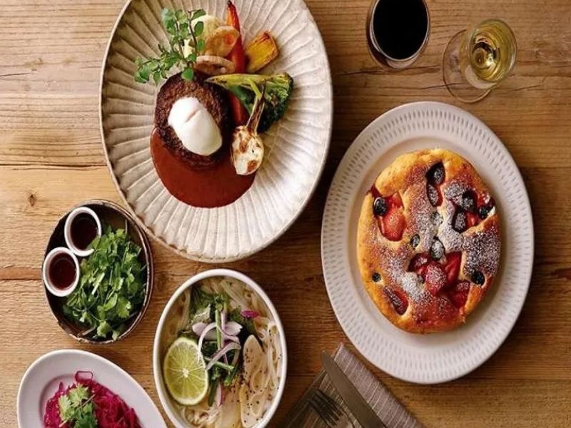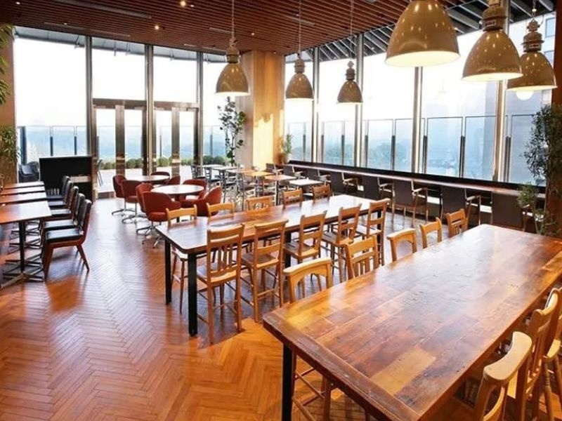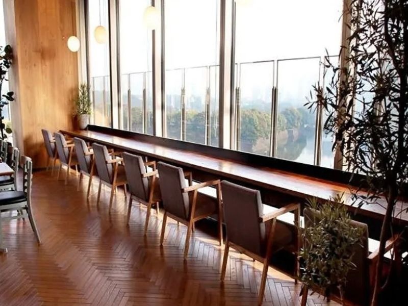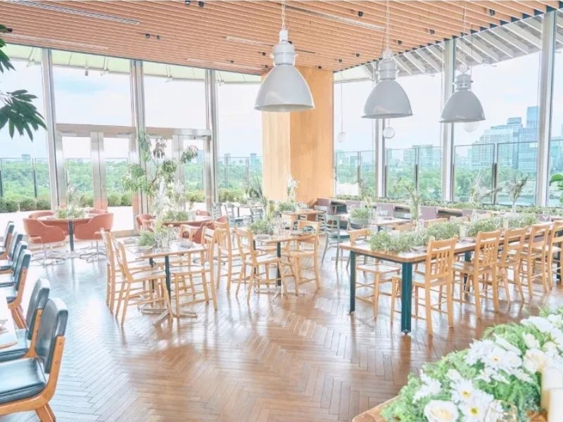 東京ミッドタウン日比谷の6F「BASE Q」の中にあるレストラン。フロアからインテリアに至るまで全てウッド調の素材で統一された店内は、木の温もりに溢れた居心地の良い空間。忙しい毎日を忘れて、ゆったりとくつろぐことができる。店舗は大きな窓にぐるりと囲まれており、そこから眺められる絶景も魅力的なポイント。青々とした日比谷公園・皇居の緑と丸の内のビル群が調和する、都会的でありながら自然を感じられる景色に心を奪われること間違いなし。