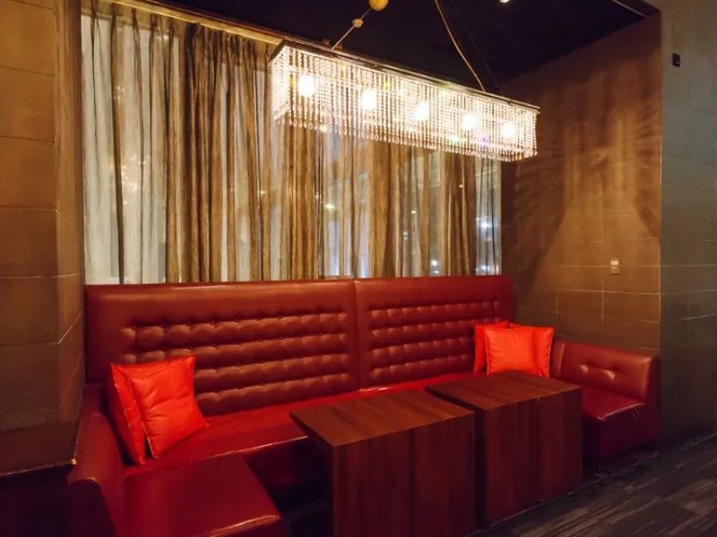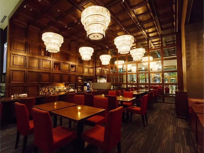 ウッド調の内装に、ゴージャスなシャンデリア群が特徴的なオシャレなラウンジ。爽やかな風が吹き抜ける通りに面したテラス席は、開放感たっぷり。