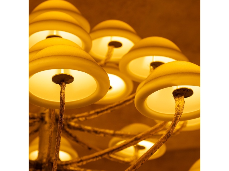 階段を上がり、真っ赤な取っ手がついた白い扉を開けると、そこに広がるのは大人の上質空間。いちごで染めた和紙が張り巡らされた壁、金箔を貼ったシャンデリア、中央に佇むグランドピアノ……。