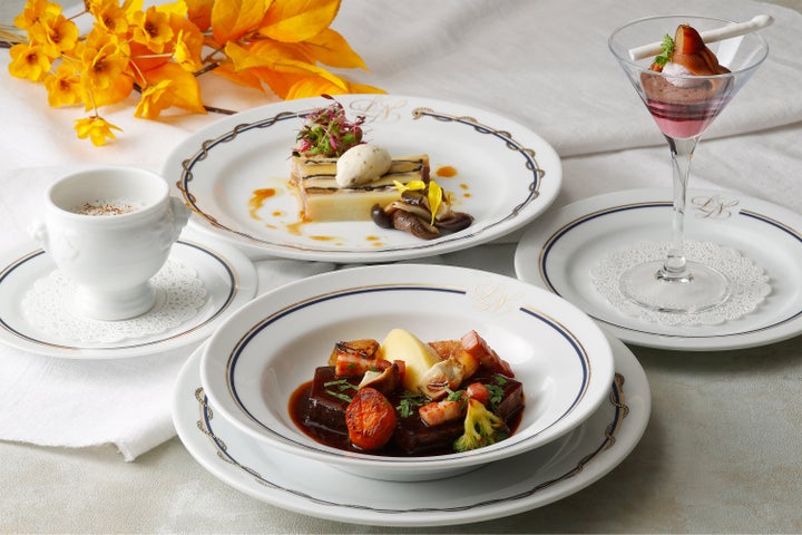 また、ディナーでは、フランスで「キノコの王様」と称されるセップ茸を使用した前菜「セップ茸のなめらかなヴルーテ ヘーゼルナッツとチョリソ」をはじめ、ホロホロ鳥、フォアグラ、トランペット茸をふんだんに使用した濃厚な「岩手県石黒農場産ホロホロ鳥と里芋・フォアグラ・トランペット茸のガランティーヌ」をご用意。さらに、メインには、国産牛のフィレ肉と牛ホホ肉のワイン煮込みを2種類の調理法で楽しめる「食いしん坊の一皿 国産牛肉を2つの調理法で」をご提供いたします。