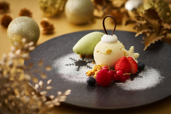 「クリスマススイーツバイキング」の目玉は、シェフがこのイベントのために仕上げた「ホワイトチョコと苺のクゲール仕立て ピスタチオアイス添え」。ホワイトチョコと苺でクリスマスオーナメントをイメージし、ピスタチオアイスを添えた一皿は、見た目も味わいも特別です。小学生以上のお客様一人ひと皿ずつ、お席までお届けします。