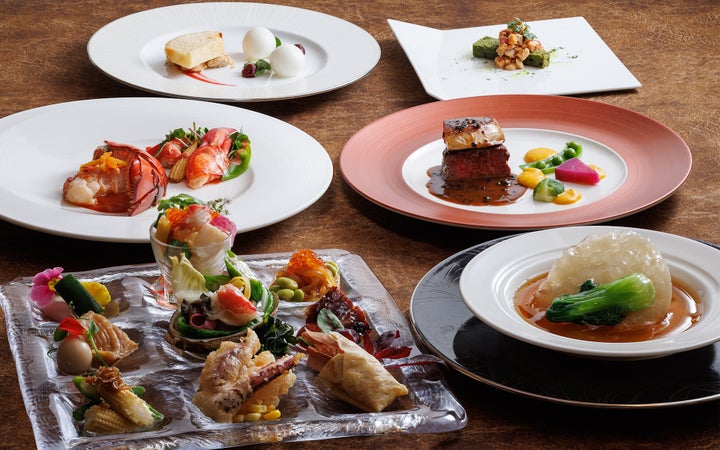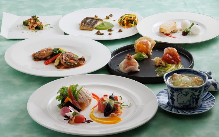 「シェフ&シェフ コラボレーションコース」では、それぞれランチ、ディナープランをご用意。ランチ・ディナーでそれぞれメニューが異なり、旬の食材を生かした一品料理や冷菜の盛り合わせ、フカヒレを使用した壺蒸しスープ、大海老を贅沢に食べ比べができる「むき大海老三種の味わい」、オマール海老の鉄板焼きなど、中国料理とフランス料理の両方の味わいを贅沢に堪能いただけるメニューが並びます。