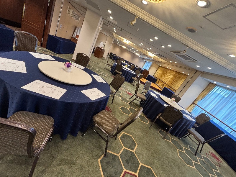 立食も着席も対応可能!ステージ・司会台無料で設置しております。